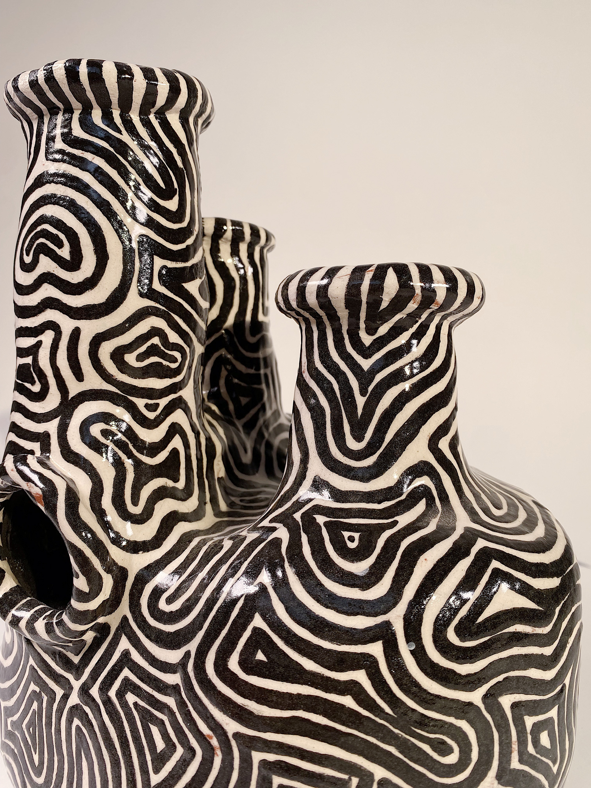 Valved Vase, is a hand-built terracotta vase using a coiling technique. Slip and underglaze were painted and applied to the form to give the white base and black detailed design.