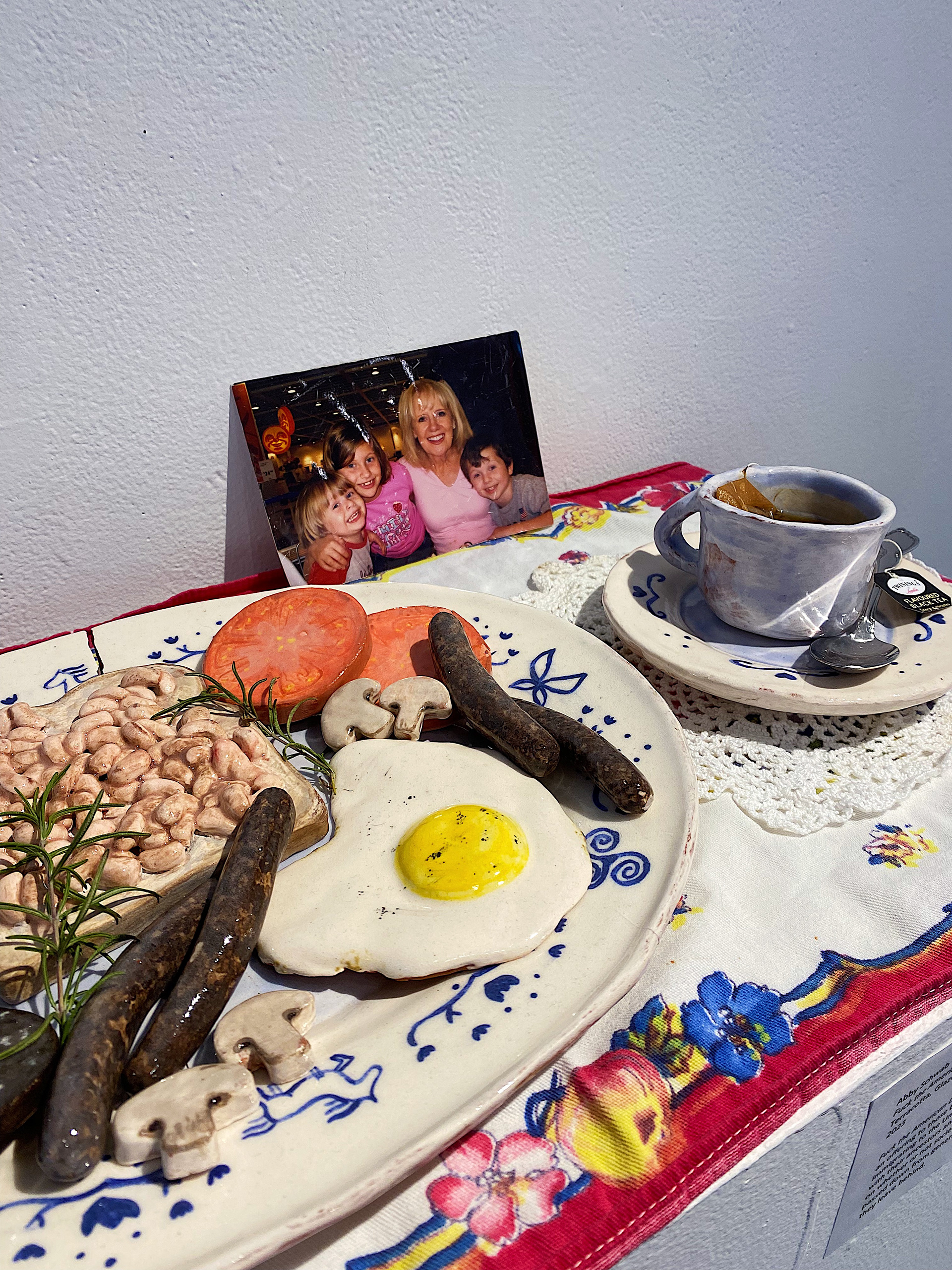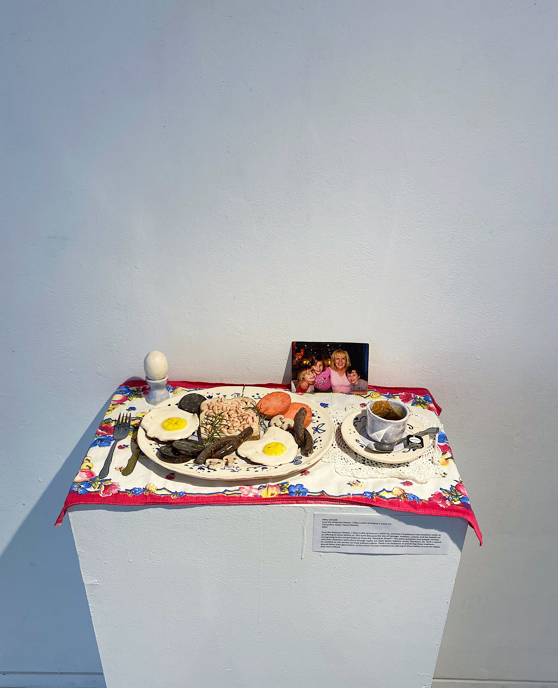 Fuck the American Dream, I Want a Bite of Granny’s Ulster Fry, portrays a traditional Irish breakfast made as an offering to those before us. This work discusses the loss of heritage, tradition, culture, and the impacts of immigrating to the United States to chase the “American Dream”. This piece questions how people connect with their ancestors and culture through myths, art, food, dance, folklore, music, literature, etc. With a search on whether or not society can exist without culture. There is an emphasis on preserving these traditions passed down from generations, so this Ulster Fry was created as an offering to those before us and the legacy they leave behind.